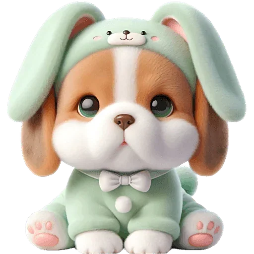 Um cachorro fofinho vestido com um pijama verde claro com orelhas de coelho e uma gravata borboleta branca. O cachorro tem olhos grandes e expressivos.