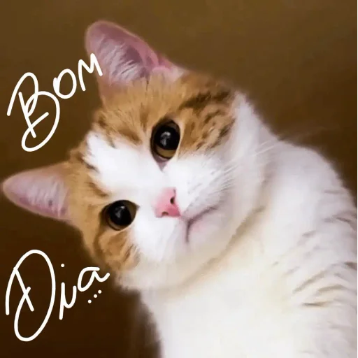 Gato laranja e branco com olhos grandes e focados, texto 'Bom Dia' ao lado.