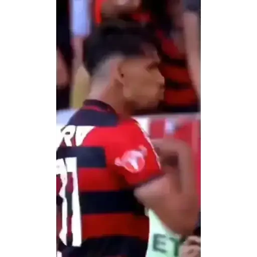Jogador de futebol com camisa do Flamengo, marca BRL e HAVAN, com expressão de comemoração.