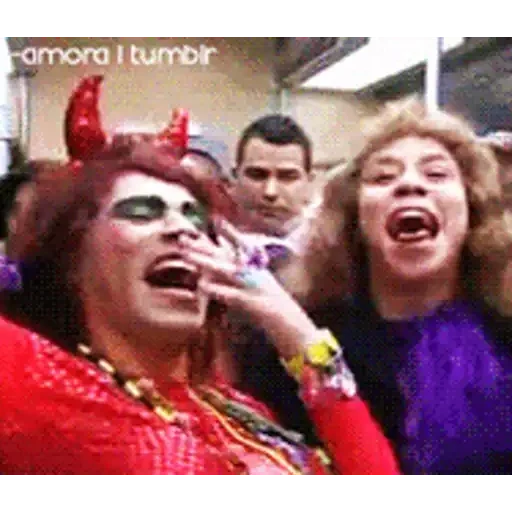 Uma imagem de duas pessoas com expressões engraçadas, uma vestida de diabo e a outra com um look colorido, com um homem ao fundo. 'amora I tumblr'