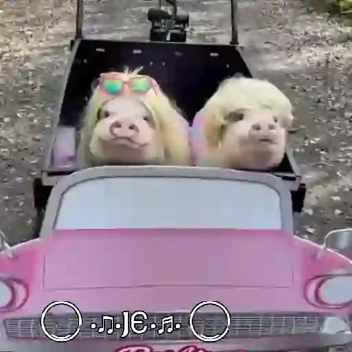 Dois porcos com cabeças de boneca sentados em um carro rosa, com óculos de sol na porca da esquerda.