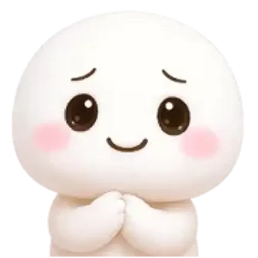Um personagem de desenho animado com corpo branco e olhos castanhos grandes, mãos juntas e rosado nas bochechas, com uma expressão de súplica ou desejo.