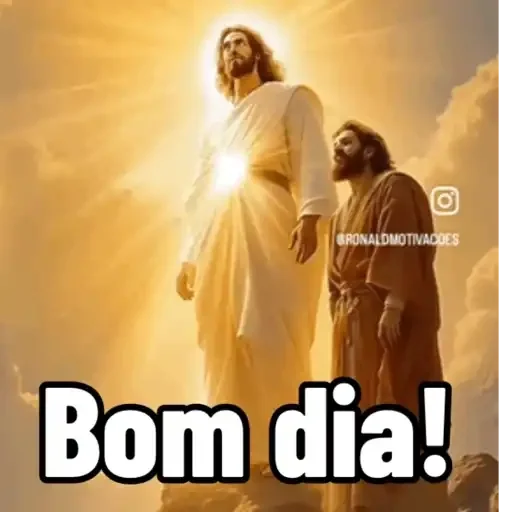 Imagem de Jesus Cristo com auréola e luz ao fundo, ao lado de outra pessoa, com o texto 'Bom dia!' em destaque.