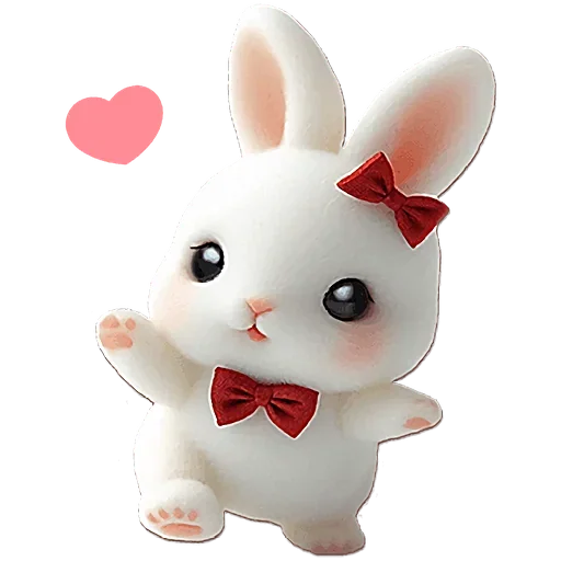 Um coelho branco fofinho com um laço vermelho no pescoço e outro no cabelo, com um coração rosa ao lado.