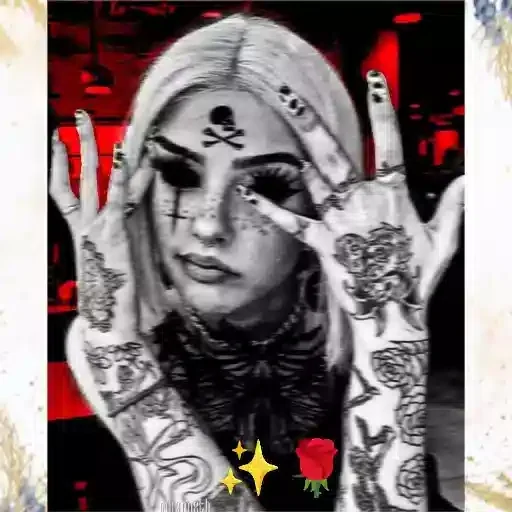 Mulher com tatuagens e maquiagem pesada, fazendo um gesto com as mãos. Ela tem um crânio desenhado na testa e várias tatuagens nos braços.
