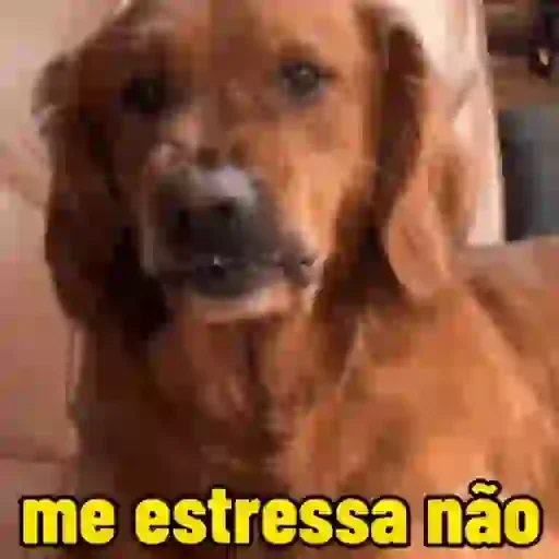Um cachorro dourado com expressão séria, olhando diretamente para a câmera. A legenda 'me estressa não' aparece em amarelo na parte inferior.