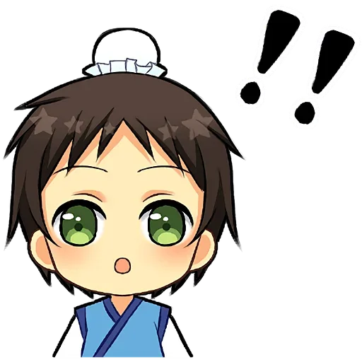 Menino de anime com expressão surpresa, usando um yukata azul e com uma panela na cabeça. Ele tem olhos verdes grandes e está fazendo um gesto de surpresa com a boca aberta.