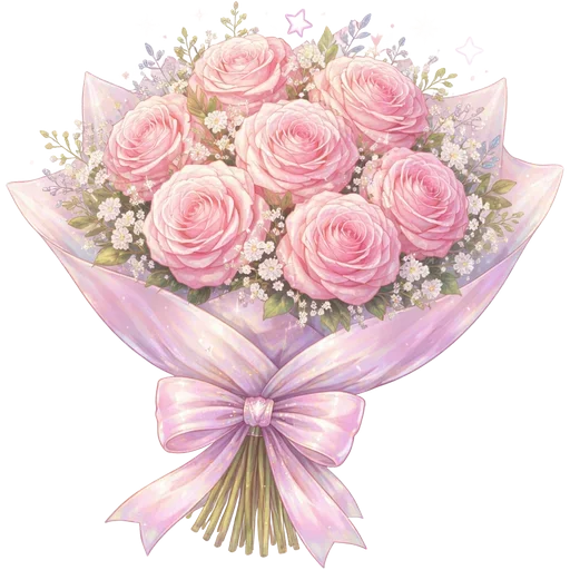 Um buquê de rosas cor-de-rosa claro, embrulhado em papel lilás e decorado com laço. O buquê é composto por várias rosas grandes e flores menores ao redor.