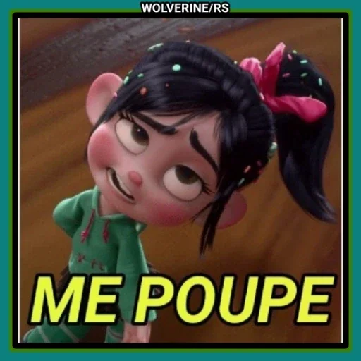 Uma menina de olhos castanhos e cabelos pretos com um laço rosa, vestindo uma blusa verde, com um sorriso tímido e o texto 'ME POUPE' em amarelo.