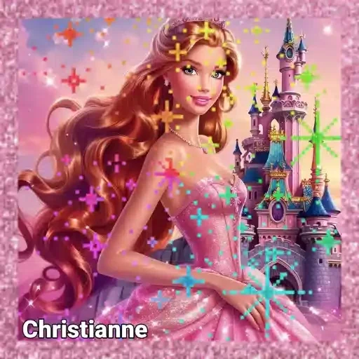 Uma princesa de cabelos castanhos longos e ondulados, vestida com um vestido rosa, em frente a um castelo com estrelas coloridas ao redor. O nome 'Christianne' aparece no canto inferior esquerdo.