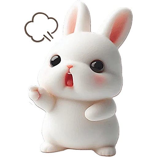 Um coelho branco fofo com olhos grandes e orelhas compridas, parecendo surpreso ou assustado, com uma bolha de fala vazia ao lado.