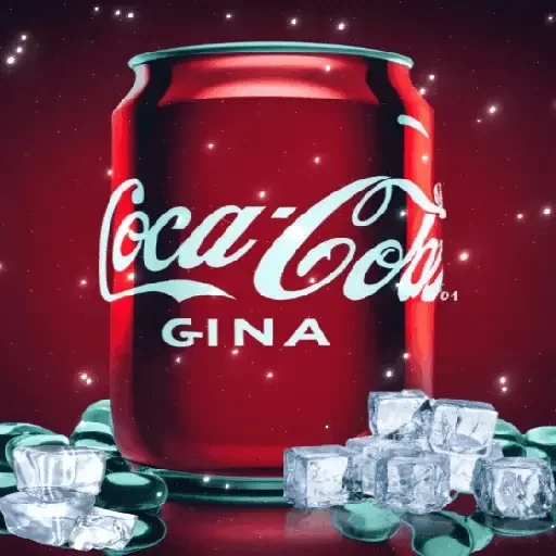 Lata de Coca-Cola com o nome 'Gina' escrita embaixo, rodeada de gelo e moedas em um fundo vermelho escuro com estrelas brilhantes.
