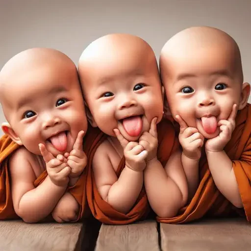Três bebês vestidos com roupas laranjas, carecas, fazendo caretas e mostrando a língua. Eles estão sentados em uma superfície de madeira.