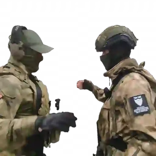 Dois homens de uniforme militar conversando, um com o rosto descoberto e o outro com máscara preta, ambos com equipamento tático.