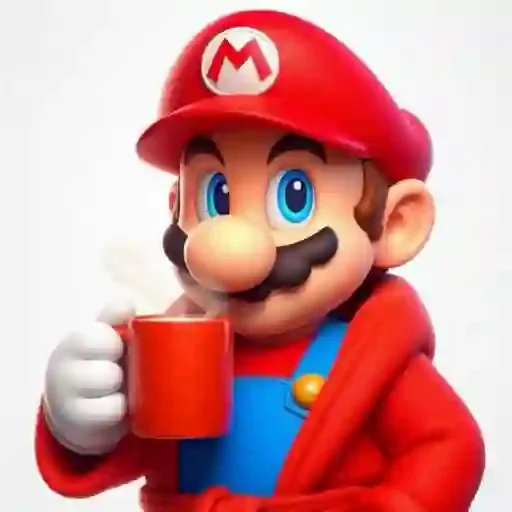 Mario, personagem de videogame, usando um casaco vermelho e segurando uma xícara vermelha de café.