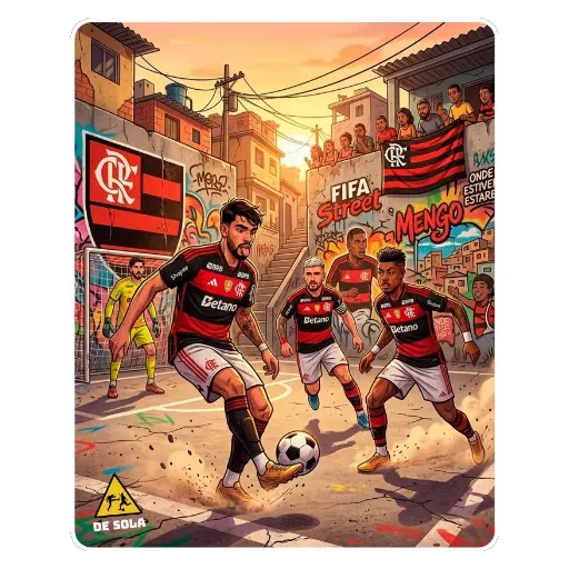 Três jogadores de futebol jogando em uma rua com grafites, vestindo uniformes do Flamengo. A imagem é uma ilustração colorida com um pôr do sol ao fundo.