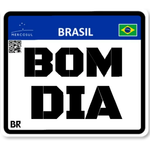 Placa de trânsito com o texto 'BOM DIA' em letras grandes, fundo branco e faixa azul com a palavra 'BRASIL' e a bandeira do Brasil.