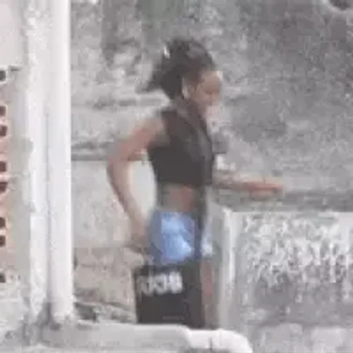 Mulher de meia-lua com cabelo preto e shorts jeans em um fundo cinza.