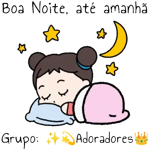 Menina de cabelos castanhos em dois coques deita-se de lado na cama com travesseiro rosa, cercada por estrelas e lua crescente, com a frase 'Boa Noite, até amanhã' e 'Grupo: Adoradores' no topo e fundo.