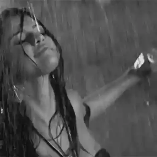 Mulher loira com os olhos fechados e cabelos molhados, levantando o braço direito em meio à chuva.