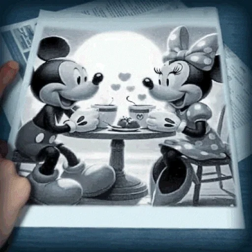 Mickey e Minnie Mouse sentados à mesa, olhando-se com carinho, em preto e branco, com corações saindo de suas xícaras de café.