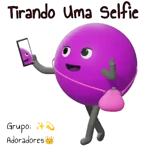 Um personagem roxo sorridente com pernas e braços, tirando uma selfie com um celular, com o texto 'Tirando Uma Selfie' acima e 'Grupo: Adoradores' abaixo.