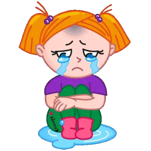 Menina de cabelos laranjas trançados chorando, com olhos azuis lacrimejantes, vestindo uma camiseta roxa, calça verde e botas rosa, sentada em uma poça de água.