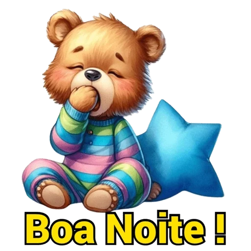 Um ursinho de pelúcia sentado com uma estrela azul ao lado, vestindo uma roupa listrada colorida, com a mão na boca e os olhos fechados. Abaixo dele está escrito 'Boa Noite !'