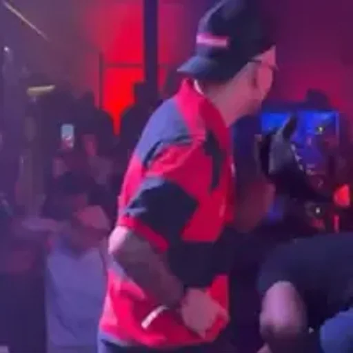 Homem de meia idade com camisa vermelha e preta e boné dançando em uma multidão em um ambiente noturno com iluminação vermelha.