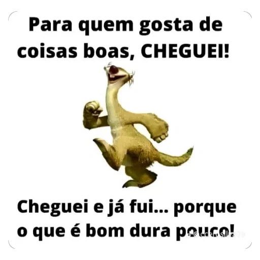 Um dinossauro amarelo dançando com texto em preto. O texto diz 'Para quem gosta de coisas boas, CHEGUEI! Cheguei e já fui... porque o que é bom dura pouco!'