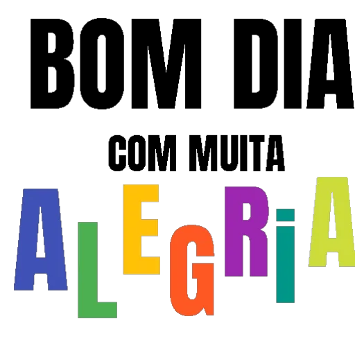 Um sticker com a frase 'BOM DIA COM MUITA ALEGRIA' em letras grandes e coloridas.
