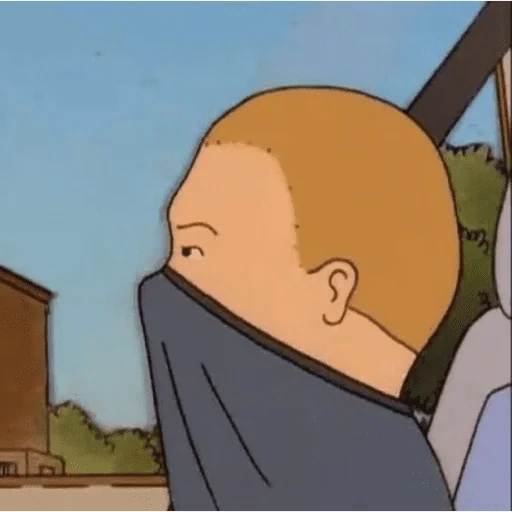Menino de cabelos castanhos claros com expressão surpresa ou assustada, vestindo um casaco cinza escuro, em um cenário de fundo azul com árvores e uma casa.