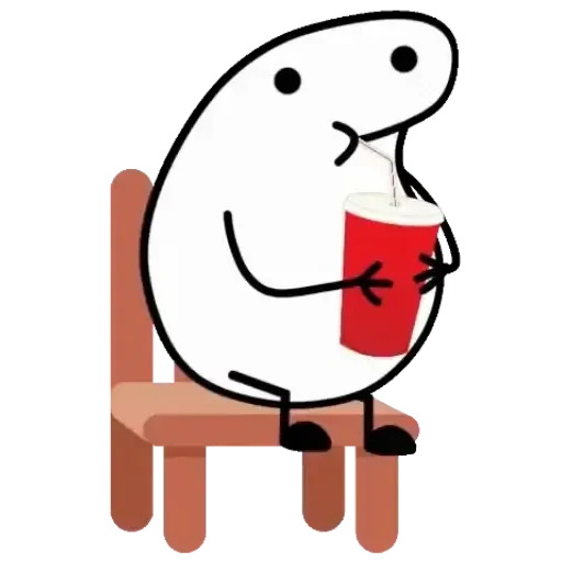 Um personagem de desenho animado branco e redondo, com olhos pretos e um sorriso, sentado em uma cadeira laranja, bebendo de um copo vermelho com canudo.