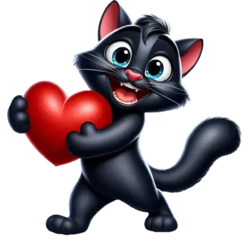 Gato preto de olhos azuis e orelhas rosa, com um coração vermelho na pata.