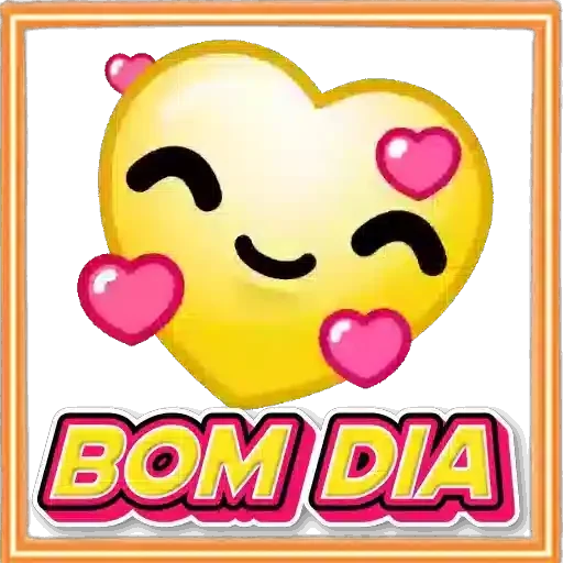 Um coração amarelo com olhos fechados e sorriso, decorado com pequenos corações rosados, acompanhado do texto 'BOM DIA'.
