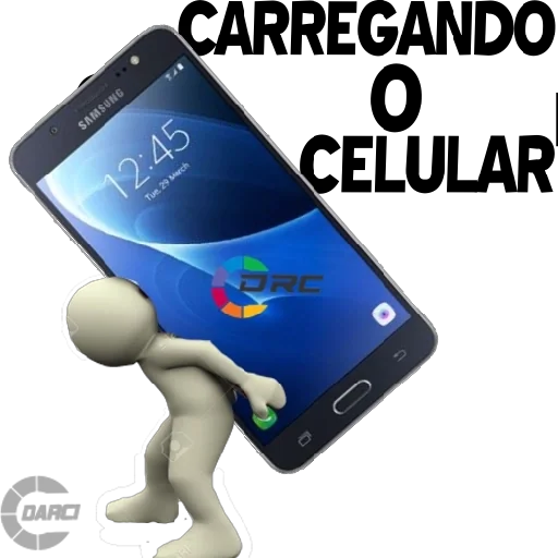 Um boneco de argila está carregando um celular com a tela azul e o texto 'CARREGANDO O CELULAR' em letras pretas grandes.