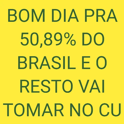 Um texto em verde sobre fundo amarelo que diz 'BOM DIA PRA 50,89% DO BRASIL E O RESTO VAI TOMAR NO CU'
