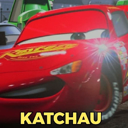 Um carro vermelho de corrida com olhos grandes e um sorriso, texto 'KATCHAU' em amarelo na parte inferior.