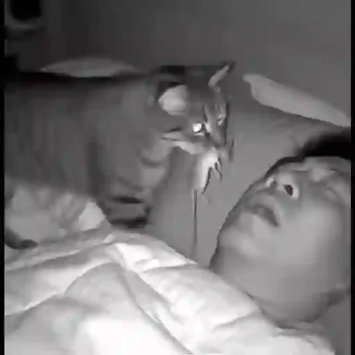 Um gato cinza observa um homem deitado na cama com expressão surpresa, ambos em preto e branco.