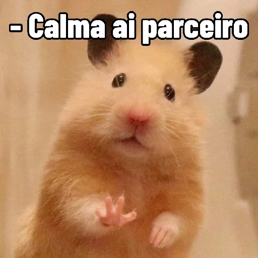 Um hamster com as patas dianteiras levantadas e orelhas pretas, com o texto 'Calma aí parceiro' sobreposto.