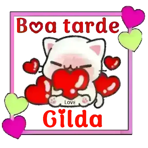 Um gato branco fofinho com um coração vermelho na frente, cercado por corações coloridos e texto 'Boa tarde Gilda'.
