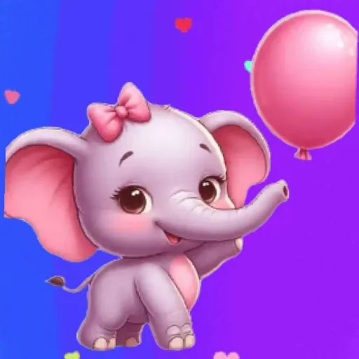 Um elefante rosa fofinho com uma faixa rosa no cabelo e um balão rosa na mão, em um fundo roxo com corações.