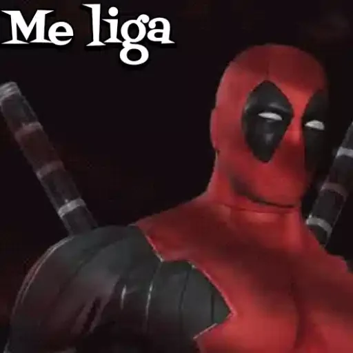 Deadpool com expressão séria e duas espadas nas costas, texto 'Me liga' no canto superior esquerdo.