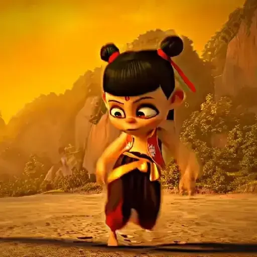 Uma menina de olhos arregalados e cabelos pretos em dois coques, vestindo uma roupa laranja e preta, correndo em um cenário de montanhas ao pôr do sol.
