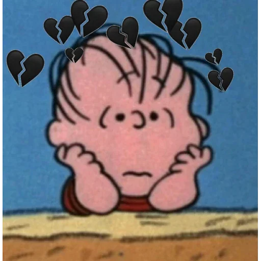Menino Charlie Brown com expressão triste, mãos na cara e corações partidos ao redor da cabeça.