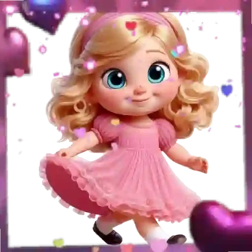 Menina de olhos azuis e cabelos louros ondulados usando um vestido rosa. Ela está rodeada de corações e confetes.