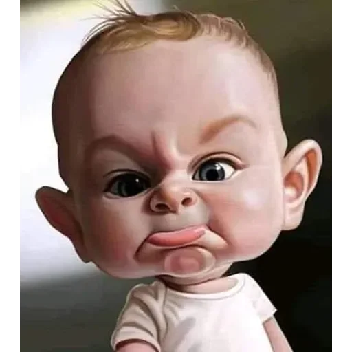 Rosto de bebê com expressão de desaprovação, usando uma camisa branca. A imagem tem aparência realista com iluminação suave.