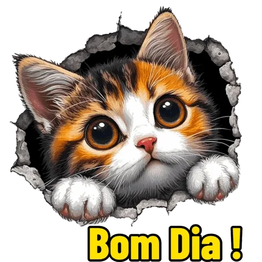 Gato com olhos grandes e pelagem laranja, branca e preta espiando por um buraco com as patas apoiadas na borda. O texto 'Bom Dia !' aparece abaixo.