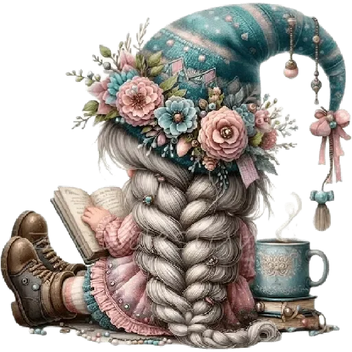 Um gnomo com chapéu decorado com flores, usando botas e roupa rosa, ao lado de uma xícara de café.