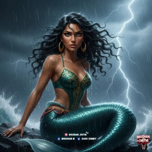 Uma sereia negra com cabelos pretos ondulados e uma cauda verde brilhante sentada em uma rocha com um raio ao fundo. Ela usa um top verde metálico e brincos grandes.